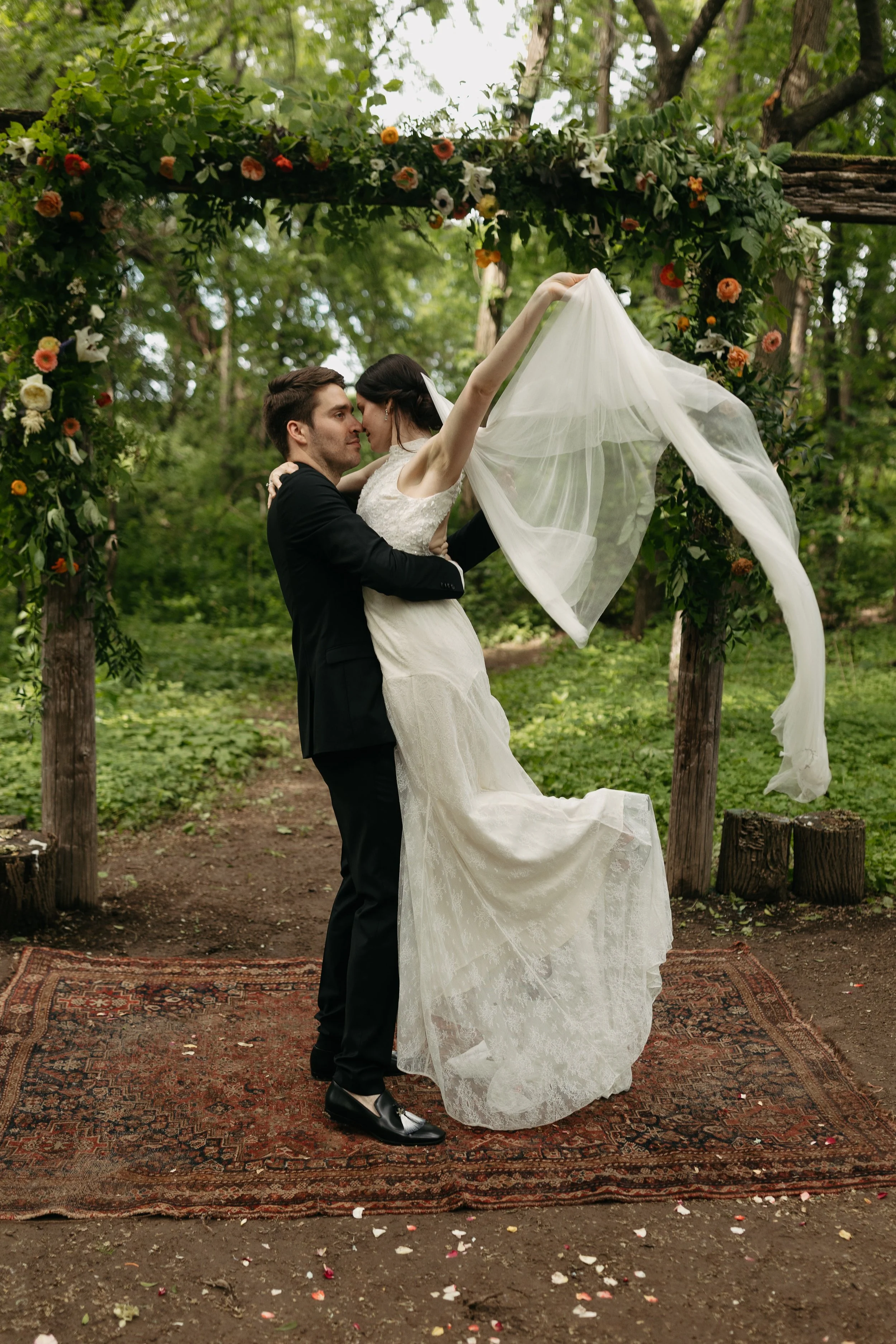 It was a timeless, romantic, floral filled soiree for the wedding of Arielle and Morgan. The gardens awaken during this season and the paths are blooming with wood rose, where little white blooms dapple the trails.